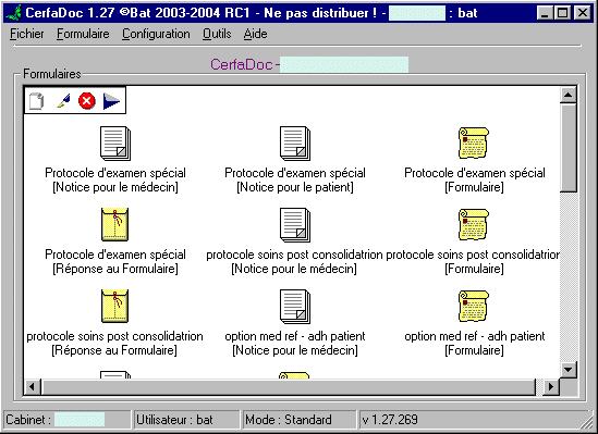 Cette fenêtre est la fenetre principale de CerfaDoc et il est possible de personnaliser l'apparence des icones. Chaque icone correspond à un formulaire ou un élément de formulaire (ex : notice, formulaire proprement dit, réponse au formulaire, etc).