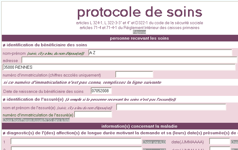 Un formulaire permettant la saisie de toutes les informations utiles s'ouvre. Ce formulaire est une page HTML (une page Web) et a un fonctionnement identique à ce genre de page. Les cases qu'il est possible de préremplir sont préremplies à partir des données du fichier patient (et c'est un des intérêts du système). Ici, le nom, le prénom, l'adresse, le N° de SS, la date de naissance sont préremplies dans cette partie du formulaire.