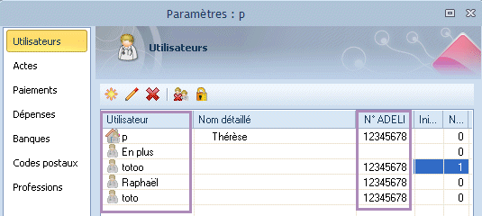 'Nom' est repris depuis "utilisateur" et "ID National" est repris depuis N° ADELI