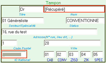 Les données de ce tampon sont préremplies avec les données présentes dans HelloDOC. Les valeurs qui ne sont pas disponibles dans HelloDOC peuvent être rentrées et modifiées par l'utilisateur. Ces valeurs sont ensuites mémorisées et reprises dans les nouveaux formulaires.